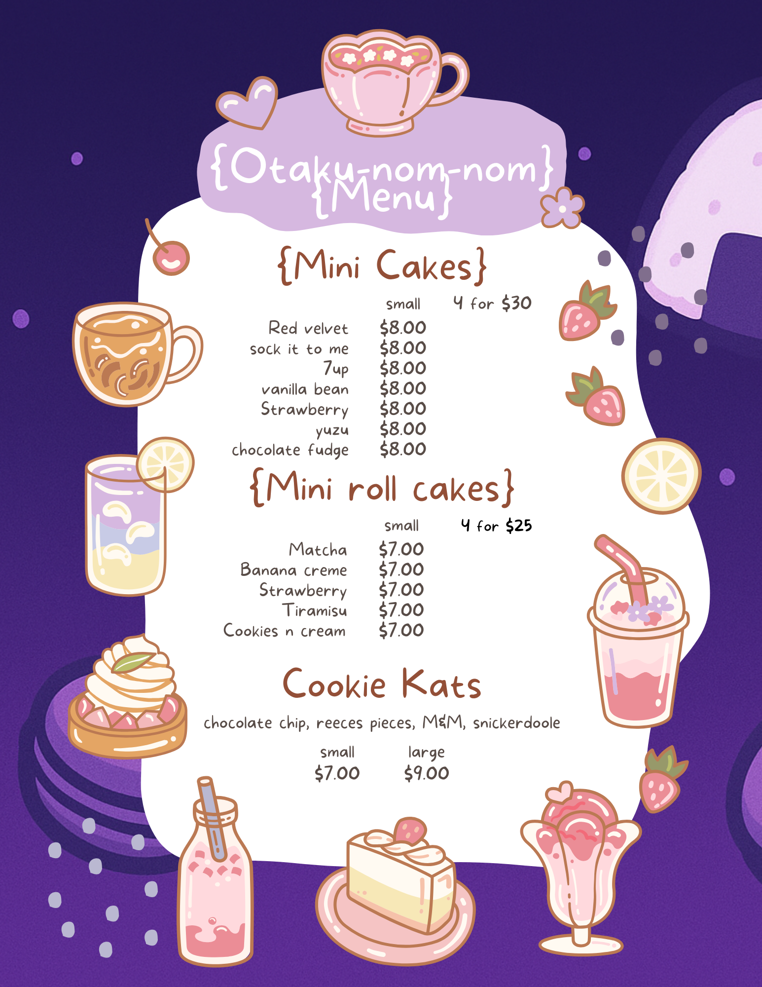 Menu featuring frosted croissants and custom cakes with various flavors and sizes, decorated with illustrations of drinks, strawberries, and desserts.